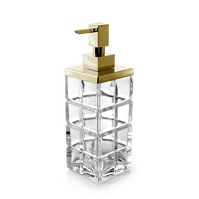 Дозатор для жидкого мыла, 3SC, Palace, механический (нажимной), ширина, мм-75, глубина, мм-75, высота, мм-230, тип установки-настольный (свободностоящий), материал колбы-хрусталь, цвет дозатора-золото Дозатор для жидкого мыла, 3SC, Palace, шгв 75*75*230, цвет дозатора-золото