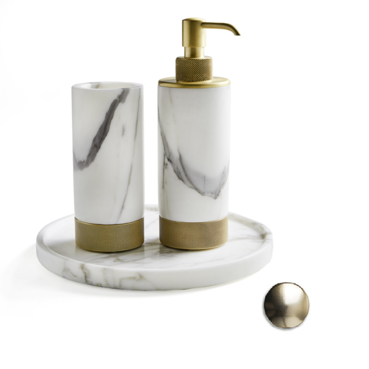 Набор аксессуаров, 3SC, Apuana 2.0, в набор входит-лоток, стакан и дозатор, ширина, мм-220, глубина, мм-220, цвет-White Statuario/латунь сатинированная матовая Набор аксессуаров, 3SC, Apuana 2.0, шг 220*220, цвет-White Statuario/латунь сатинированная матовая