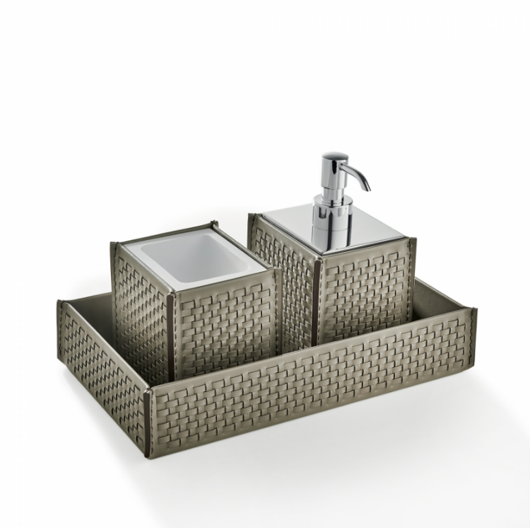 Набор аксессуаров, 3SC, Hilton, в комплекте-лоток, дозатор для жидкого мыла, контейнер для ватных дисков, материал-натуральная кожа/латунь, ширина, мм-290, глубина, мм-170, высота, мм-165, цвет-Fango/Хром Набор аксессуаров, 3SC, Hilton, лоток, дозатор для жидкого мыла, контейнер для ватных дисков, шгв 290*170*165, цвет-Fango/Хром