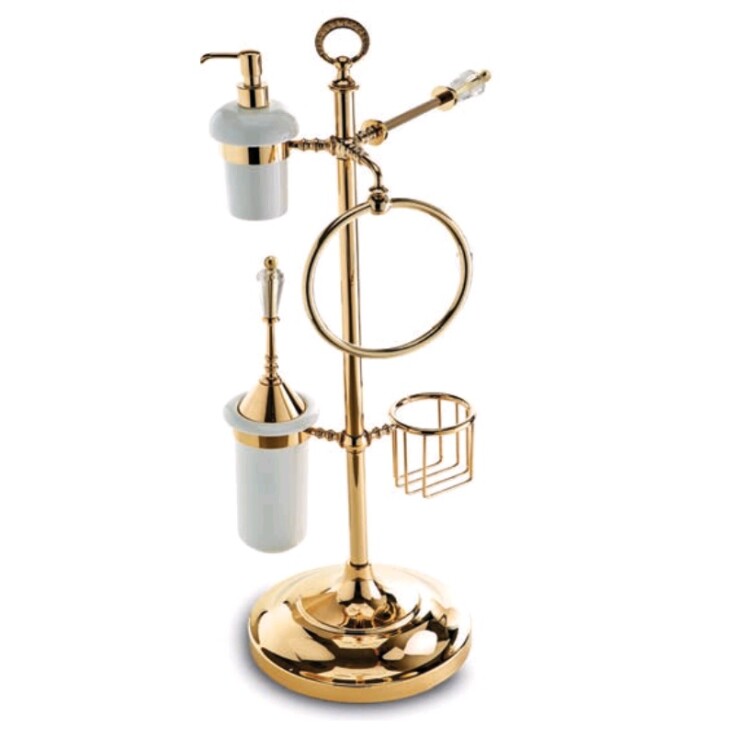 Стойка, 3SC, Boheme, напольная, ширина, мм-250, глубина, мм-250, высота, мм-800, с дежателем туалетной бумаги без крышки, держателем для телефона и ёршиком для унитаза: цвет колбы-белый, материал держателя-металл, дозатором для жидкого мыла: цвет колбы-белый, держатель-золото и полотенцедержателем-кольцо, цвет-золото (Gold, Polished Gold) Стойка, 3SC, Boheme, шгв 250*250*800, с дежателем туалетной бумаги, держателем для телефона, ёршиком, дозатором и полотенцедержателем, цвет-золото