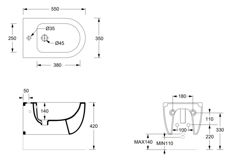 | Бачок | необходима система инсталляции, скрытый бачок |