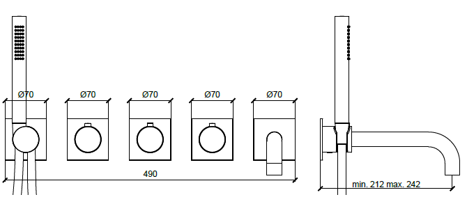 Смеситель для ванны и душа, Almar, тип открывания воды-вентильный, тип регулирования воды-термостатический картридж, монтаж-настенный встраиваемый, отверстия для монтажа-5, вынос излива, мм-242, ручной душ-в комплекте, внутренняя часть-необходимо заказать, цвет-Gun Metal Brushed PVD Смеситель для ванны и душа, Almar, цвет-Gun Metal Brushed PVD (Товар заказной, возврату не подлежит)