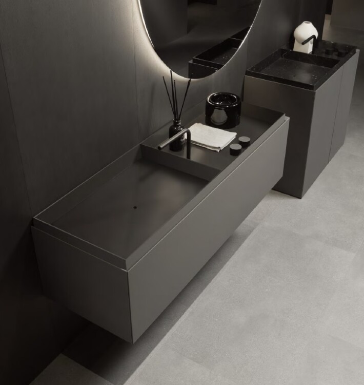Тумба под раковину, Antonio Lupi, Nabatei, ширина, мм-1440, глубина, мм-490, высота, мм-325, тип установки-подвесной, раковина-необходимо заказать, монтаж раковины-накладной, с 1 передней левосторонней панелью, столешница-необходимо заказать, ящики-2 SLIM, в комплекте с боковыми панелями, материал корпуса-МДФ, материал фасада-МДФ, цвет-Basalto seta Тумба под раковину, Antonio Lupi, Nabatei, шгв 1440*490*325, левосторонняя, раковина-необходимо заказать, цвет-Basalto seta
