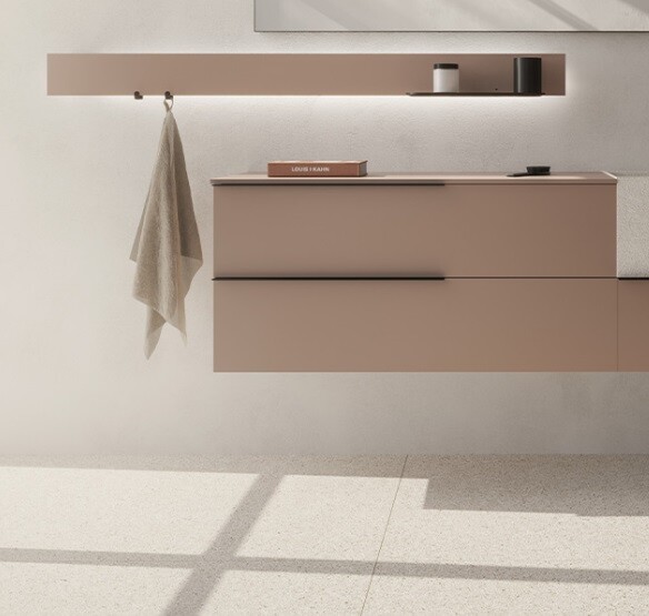 Тумба, ARBI, SKY, ширина, мм-1050, глубина, мм-500, высота, мм-490, тип установки-подвесной, столешница-необходимо заказать, ящики-2, открывание-выдвижное, вид ручки-Lato, цвет ручки-черный, длина ручки,мм-600, расположение ручки-слева, материал корпуса-ДВП ламинат, материал фасада-МДФ, цвет-Tan Pink матовый Тумба, ARBI, SKY, шгв 1050*500*490, ручка-Lato nero слева, цвет-Tan Pink матовый