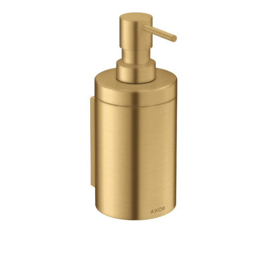 Дозатор для жидкого мыла, Axor, Axor Universal Circular, механический (нажимной), ширина, мм-76, глубина, мм-107, высота, мм-182, ёмкость(мл)-300, тип установки-настенный, материал колбы-металл, цвет колбы-шлифованное золото, цвет дозатора-шлифованное золото Дозатор для жидкого мыла, Axor, Axor Universal Circular, шгв 76*107*182, цвет дозатора-шлифованное золото