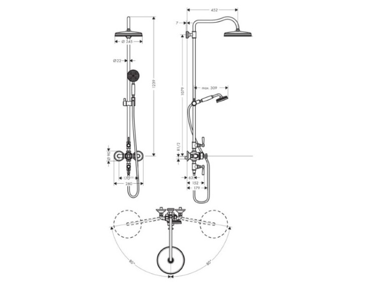 Душевая стойка, Axor, Axor Montreux, смеситель-есть, тип регулирования воды-термостатический картридж, верхний душ-есть, форма верхнего душа-круглая, размер верхнего душа-240, держатель верхнего душа-есть, поворотный, вынос, мм-430, количество режимов верхнего душа-1, тип струи верхнего душа-Rain, размер штанги, мм-1079, ручной душ-есть, с белой рукояткой, размер ручного душа-100, количество режимов ручного душа-1, тип струи ручного душа-RainAir, шланг-есть, металлический, размер шланга, мм-1600, цвет-полированная бронза, предохранительный ограничитель при 40°C, регулируемый ограничитель температуры горячей воды, пользовательское управление посредством вращения рукоятки, соединительная резьба G 1/2 Душевая стойка, Axor, Axor Montreux, цвет-полированная бронза