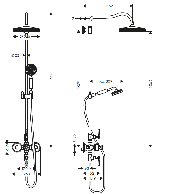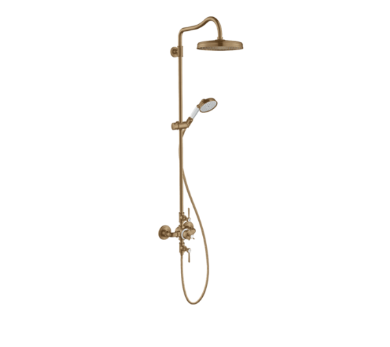 Душевая стойка, Axor, Axor Montreux, смеситель-есть, тип регулирования воды-термостатический картридж, верхний душ-есть, форма верхнего душа-круглая, размер верхнего душа-240, держатель верхнего душа-есть, вынос, мм-430, количество режимов верхнего душа-1, тип струи верхнего душа-Rain, размер штанги, мм-1079, ручной душ-есть, шланг-есть, размер шланга, мм-1600, цвет-шлифованная бронза, предохранительный ограничитель при 40°C, регулируемый ограничитель температуры горячей воды, пользовательское управление посредством вращения рукоятки, соединительная резьба G 1/2 Душевая стойка, Axor, Axor Montreux, цвет-шлифованная бронза