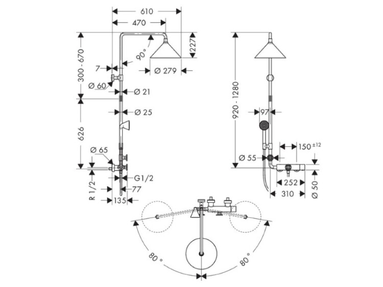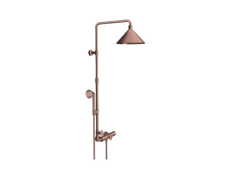 Душевая стойка, Hansgrohe, Axor Showers/Front, тип открывания воды-вентильный, тип регулирования воды-термостатический картридж, верхний душ-есть, форма верхнего душа-конусообразная, размер верхнего душа-279, держатель верхнего душа-есть, вынос, мм-400, количество режимов верхнего душа-2, тип струи верхнего душа-RainAir, Rain, телескопическая штанга верхнего душа, регулировка,мм-300, размер штанги, мм-920-1280, ручной душ-есть, размер ручного душа-85, количество режимов ручного душа-1, тип струи ручного душа-Rain, шланг-есть, с металлическим эффектом, размер шланга, мм-1600, цвет-шлифованное красное золото, регулируемый угол верхнего душа, переключение типов струи с помощью кнопки Select, поворотный держатель для душа, регулируемое по высоте крепление ручного душа, предохранительный ограничитель при 40°C, регулируемый ограничитель температуры горячей воды, соединительная резьба G 1/2 Душевая стойка, Hansgrohe, Axor Showers/Front, цвет-шлифованное красное золото
