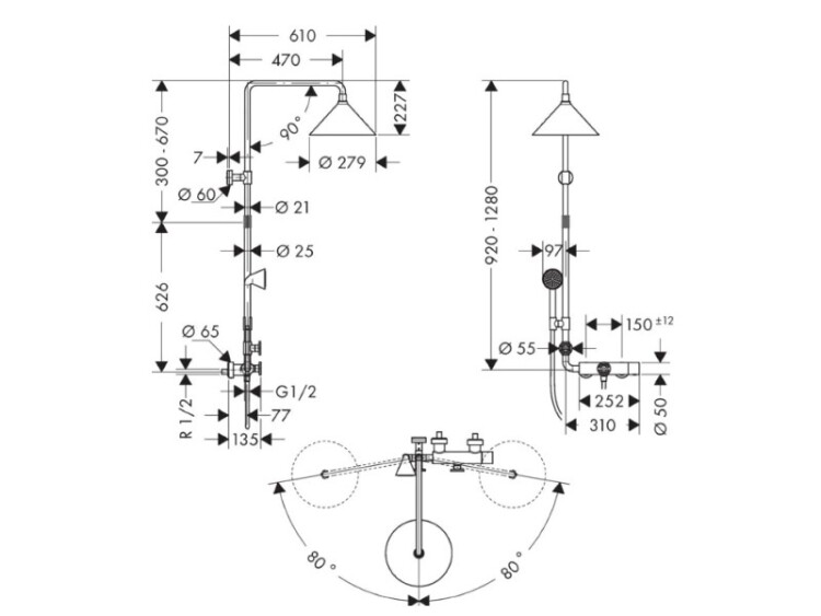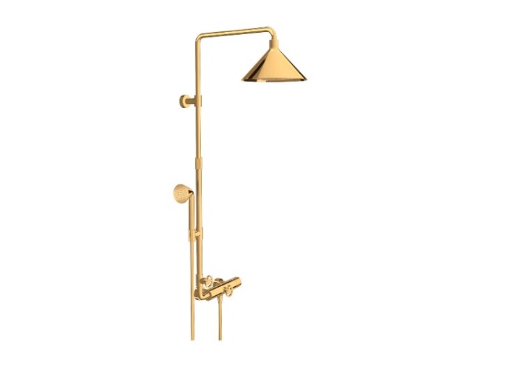 Душевая стойка, Hansgrohe, Axor Showers/Front, смеситель-есть, тип регулирования воды-термостатический картридж, верхний душ-есть, форма верхнего душа-конусообразная, размер верхнего душа-279, держатель верхнего душа-есть, поворотный, вынос, мм-400, количество режимов верхнего душа-2, тип струи верхнего душа-RainAir, Rain, телескопическая штанга верхнего душа, регулировка,мм-300, размер штанги, мм-920-1280, ручной душ-есть, размер ручного душа-97, количество режимов ручного душа-1, регулируемое по высоте крепление ручного душа, шланг-есть, размер шланга, мм-1600, цвет-шлифованное золото Душевая стойка, Hansgrohe, Axor Showers/Front, цвет-шлифованное золото