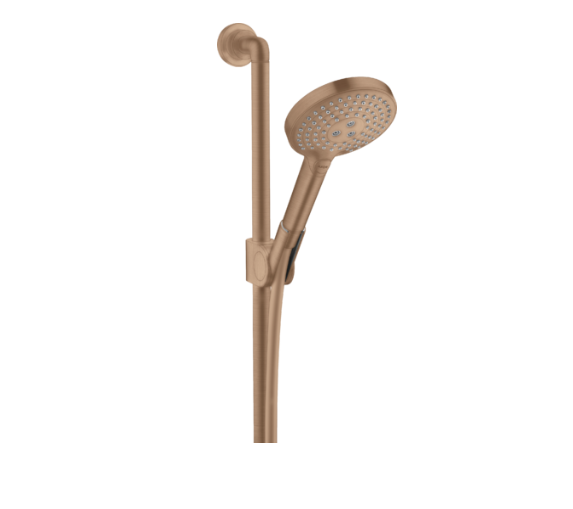 Душевой гарнитур, Axor, Axor Citterio, размер штанги, мм-900, размер шланга, мм-1600, диаметр ручного душа, мм-120, количество режимов-3, тип струи-RainAir, Rain, WhirlAir, переключение типов струи с помощью кнопки Select, цвет-шлифованное красное золото, комплектация-держатель для душевого шланга с конической гайкой, угол наклона смещается на 30°, хромированные настенные крепления из металла Душевой гарнитур, Axor, Axor Citterio, цвет-шлифованное красное золото