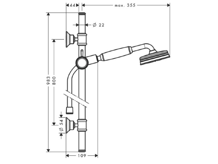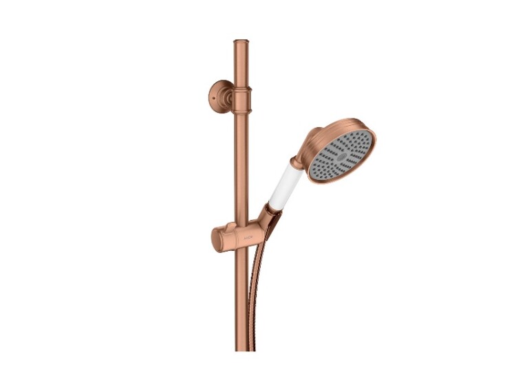 Душевой гарнитур, Axor, Axor Montreux, размер штанги, мм-900, металлический шланг, размер шланга, мм-1600, ручной душ с белой рукояткой, диаметр ручного душа, мм-100, количество режимов-1, тип струи-RainAir, цвет-шлифованное красное золото, держатель для душевого шланга с конической гайкой, хромированные настенные крепления из металла Душевой гарнитур, Axor, Axor Montreux, цвет-шлифованное красное золото
