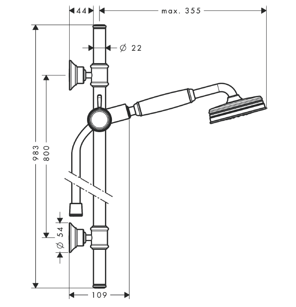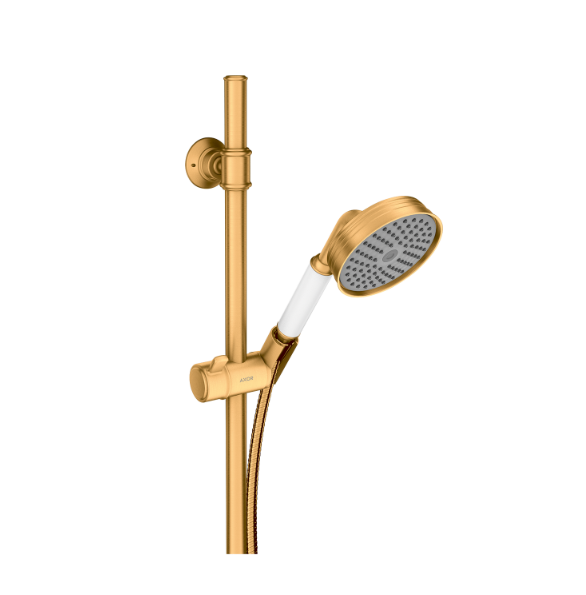 Душевой гарнитур, Axor, Axor Montreux, размер штанги, мм-900, металлический шланг, размер шланга, мм-1600, ручной душ с белой рукояткой, диаметр ручного душа, мм-100, количество режимов-1, тип струи-RainAir, в комплекте держатель для душевого шланга с конической гайкой, хромированные настенные крепления из металла, цвет-шлифованное золото Душевой гарнитур, Axor, Axor Montreux, цвет-шлифованное золото