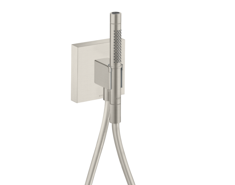 Душевой набор, Hansgrohe, Axor Starck, размер душевого диска, мм-24*139, форма лейки-цилиндрическая, количество режимов-2, держатель для душа-есть, шланг-есть, с металлическим напылением, длина шланга, мм-1250, шланговое подключение-есть, цвет-сталь, металлическая розетка,мм-120*120 Душевой набор, Hansgrohe, Axor Starck, цвет-сталь