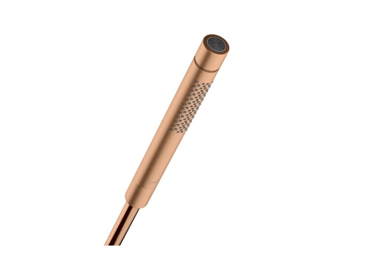 Ручной душ, Hansgrohe, Axor Starck, размер душевого диска, мм-24*68, форма-цилиндрическая, количество режимов-2, тип струи-Rain, Mono, цвет-шлифованная бронза, переключение типов струи с помощью вращающегося душевого диска, промывающийся грязеулавливающий фильтр, соединительная резьба G ½ Ручной душ, Hansgrohe, Axor Starck, 24*68, цвет-шлифованная бронза