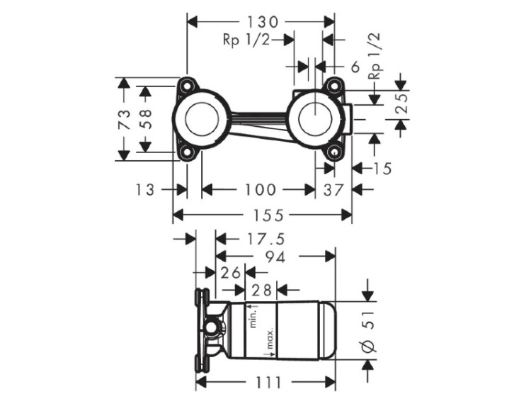 Внутренняя часть, Axor, назначение-для смесителя однорычажного настенного монтажа, стандарт подвода воды-1/2", комплектация-промывочный блок, универсальное размещение системы смешивания по выбору слева или справа от излива Внутренняя часть, Axor, для смесителя однорычажного настенного монтажа