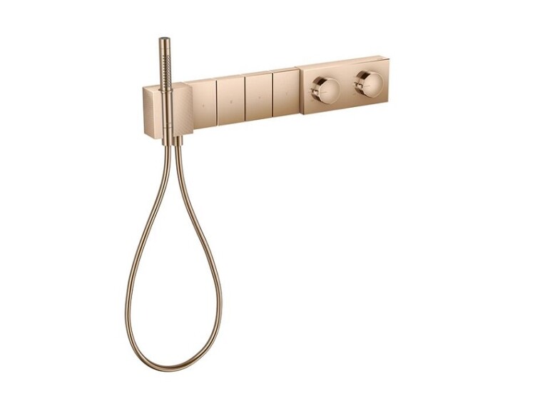 Смеситель для душа, Axor, Axor Edge, тип открывания воды-вентильный, тип регулирования воды-термостатический картридж, монтаж-вертикальный встраиваемый (настенный), внутренняя часть-необходимо заказать, в комплекте-шланг для душа, ручной душ, держатель для душа, цвет-полированное красное золото Смеситель для душа, Axor, Axor Edge, цвет-полированное красное золото