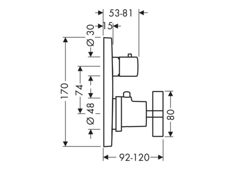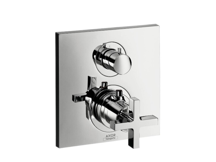 Смеситель для душа, Hansgrohe, Axor Citterio, тип открывания воды-вентильный, тип регулирования воды-термостатический картридж, тип установки-встраиваемый, отверстия для монтажа-2, вид ручки-крестовый, внутренняя часть-необходимо заказать, цвет-сталь, 1 потребитель, с запорным вентилем, предохранительный ограничитель при 38°C, регулируемое ограничение температуры Смеситель для душа, Hansgrohe, Axor Citterio, цвет-сталь