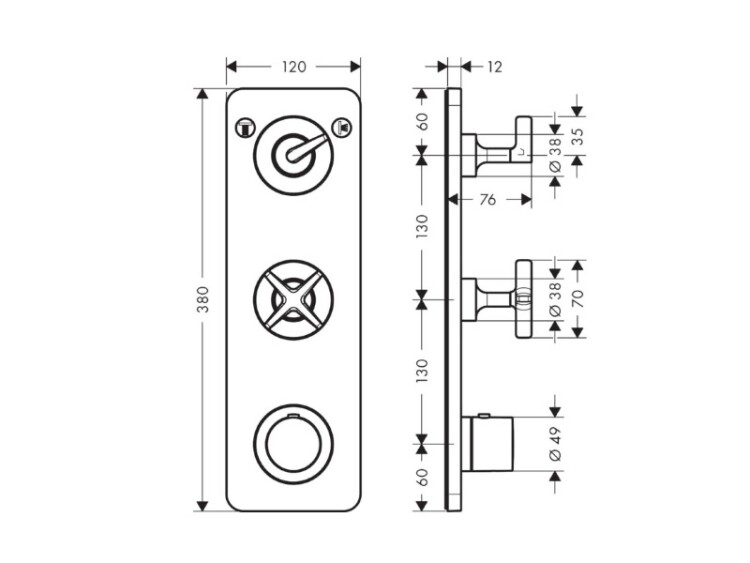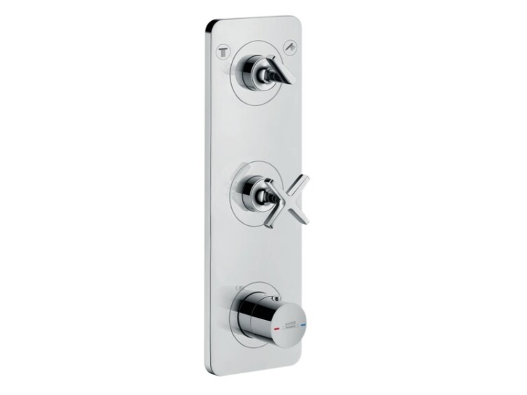 Смеситель для душа, Hansgrohe, Axor Citterio E, тип открывания воды-вентильный, тип регулирования воды-термостатический картридж, тип установки-встраиваемый, отверстия для монтажа-3, внутренняя часть-необходимо заказать, цвет-шлифованный черный хром, панель, 2 потребителя, предохранительный ограничитель Смеситель для душа, Hansgrohe, Axor Citterio E, цвет-шлифованный черный хром
