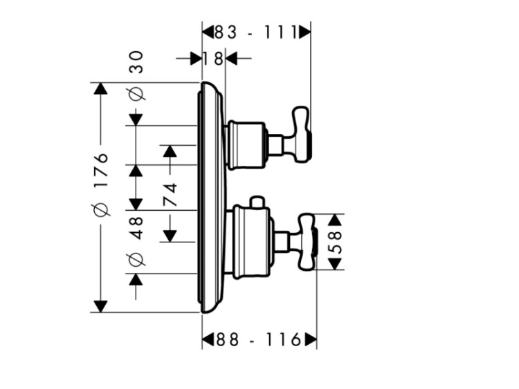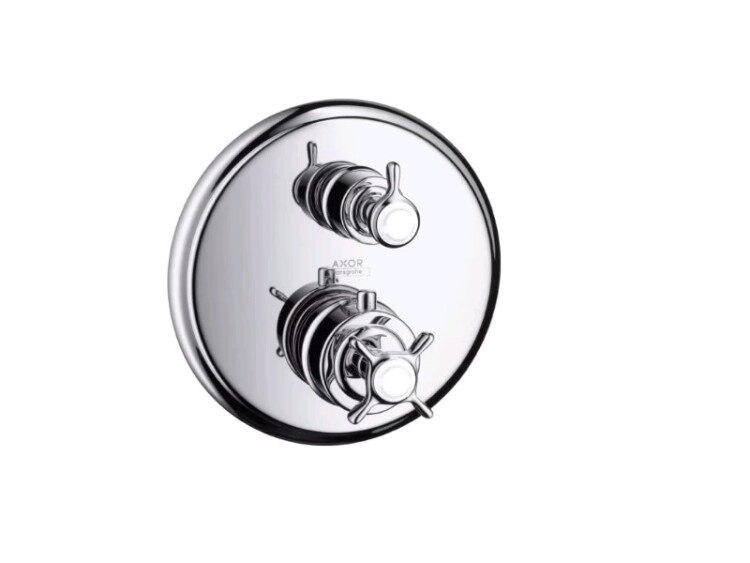 Смеситель для душа, Hansgrohe, Axor Montreux, тип регулирования воды-термостатический картридж, тип установки-встраиваемый, внутренняя часть-необходимо заказать, цвет-полированное золото, 1 потребитель, с запорным вентилем, предохранительный ограничитель при 40°C, регулируемое ограничение температуры, клапан обратного тока воды, с шумопоглотителем Смеситель для душа, Hansgrohe, Axor Montreux, цвет-полированное золото