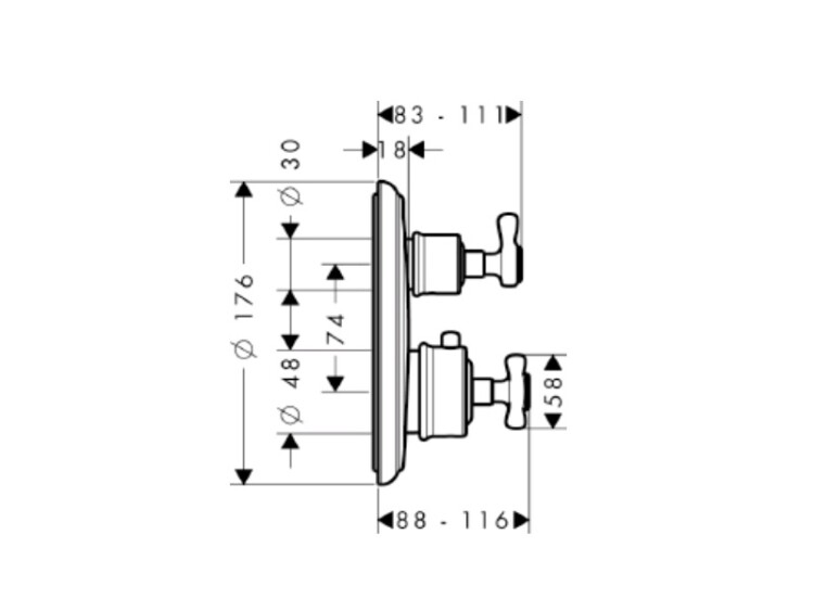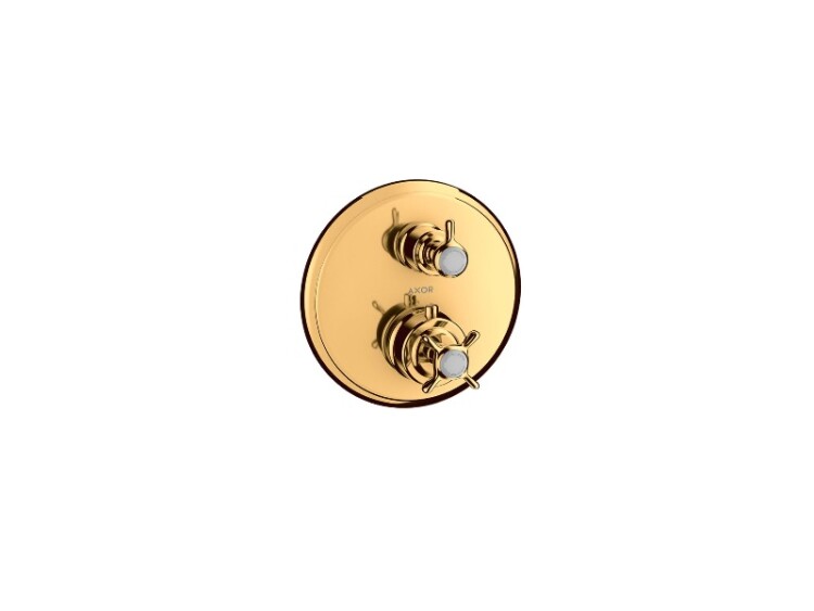 Смеситель для душа, Hansgrohe, Axor Montreux, тип открывания воды-вентильный, тип регулирования воды-термостатический картридж, тип установки-встраиваемый, отверстия для монтажа-2, внутренняя часть-необходимо заказать, предохранительный ограничитель при 40°C, регулируемое ограничение температуры, клапан обратного тока воды, с шумопоглотителем, с запорным/переключающим вентилем, 2 потребителя, цвет-полированное золото Смеситель для душа, Hansgrohe, Axor Montreux, цвет-полированное золото