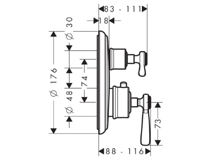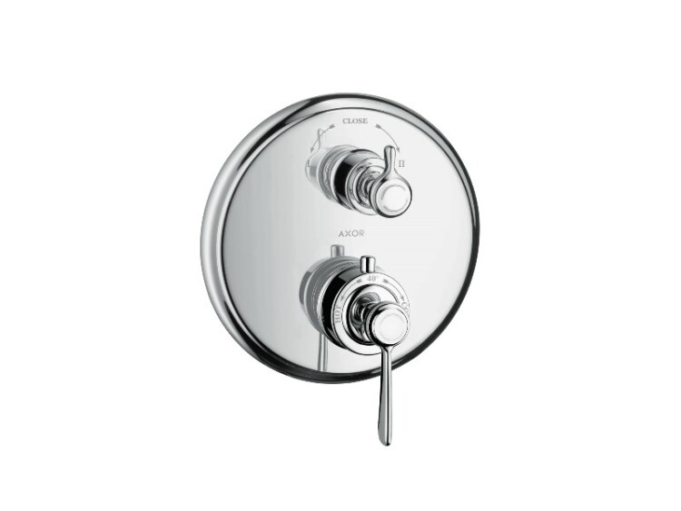 Смеситель для душа, Hansgrohe, Axor Montreux, тип открывания воды-однорычажный, тип регулирования воды-термостатический картридж, тип установки-встраиваемый, отверстия для монтажа-2, вид ручки-рукоятка, внутренняя часть-необходимо заказать, цвет-шлифованная бронза, 2 потребителя, с запорным/переключающим вентилем, предохранительный ограничитель при 40°C, регулируемое ограничение температуры, клапан обратного тока воды, с шумопоглотителем Смеситель для душа, Hansgrohe, Axor Montreux, цвет-шлифованная бронза