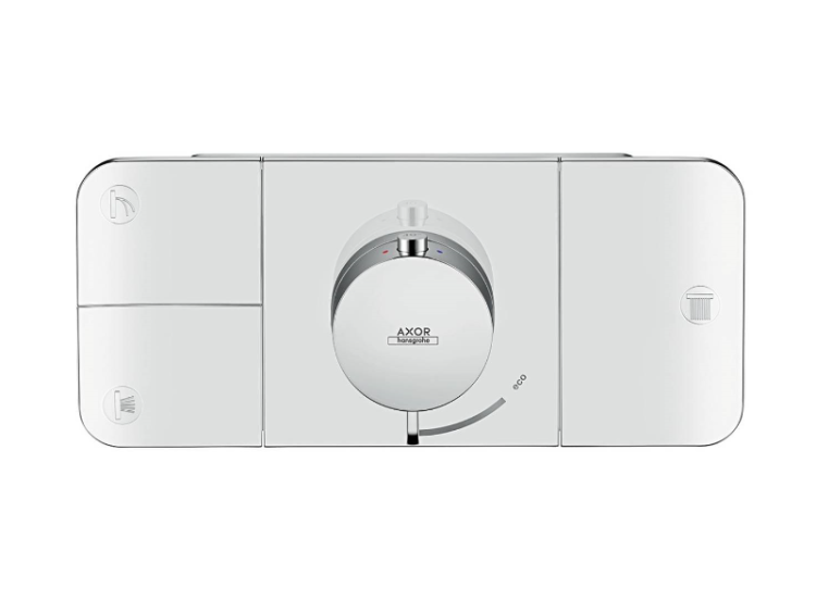 Смеситель для душа, Hansgrohe, Axor One, тип регулирования воды-термостатический картридж, тип установки-встраиваемый, внутренняя часть-необходимо заказать, цвет-под сталь, 3 потребителя и 1 дополнительный потребитель, включение/выключение кнопкой Select, предохранительный ограничитель при 40°C, регулируемое ограничение температуры, термостат с возможностью термической дезинфекции, клапан обратного тока воды Смеситель для душа, Hansgrohe, Axor One, цвет-под сталь