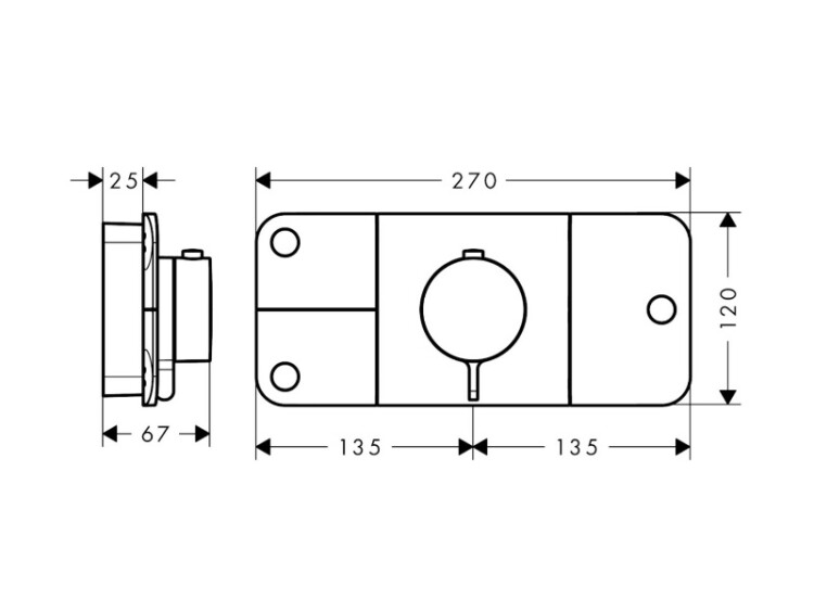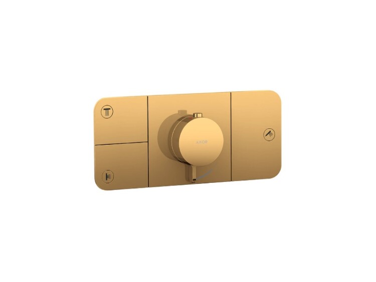 Смеситель для душа, Hansgrohe, Axor One, тип регулирования воды-термостатический картридж, тип установки-встраиваемый, отверстия для монтажа-1, внутренняя часть-необходимо заказать, цвет-полированное золото, 3 потребителя и 1 дополнительный потребитель, включение/выключение кнопкой Select, предохранительный ограничитель при 40°C, регулируемое ограничение температуры, термостат с возможностью термической дезинфекции, клапан обратного тока воды Смеситель для душа, Hansgrohe, Axor One, цвет-полированное золото