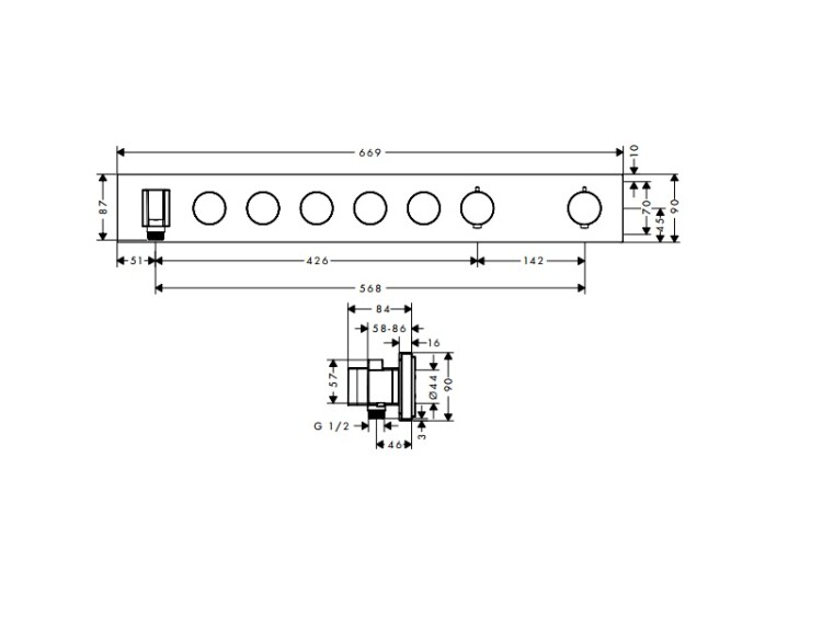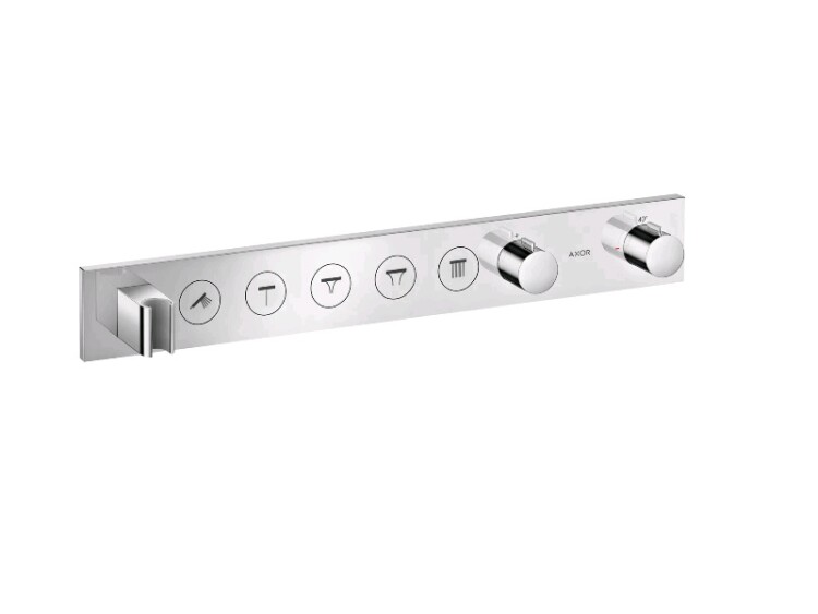 Смеситель для душа, Hansgrohe, Axor ShowerSolutions, тип регулирования воды-термостатический картридж, тип установки-встраиваемый, внутренняя часть-необходимо заказать, цвет-шлифованный никель, кнопка включения/выключения Select для 5 потребителей, предохранительный ограничитель при 40°C, регулируемое ограничение температуры, кнопка Rain large, кнопка ручной душ, кнопка режима моно, встроеный держатель дя ручного душа Смеситель для душа, Hansgrohe, Axor ShowerSolutions, цвет-шлифованный никель