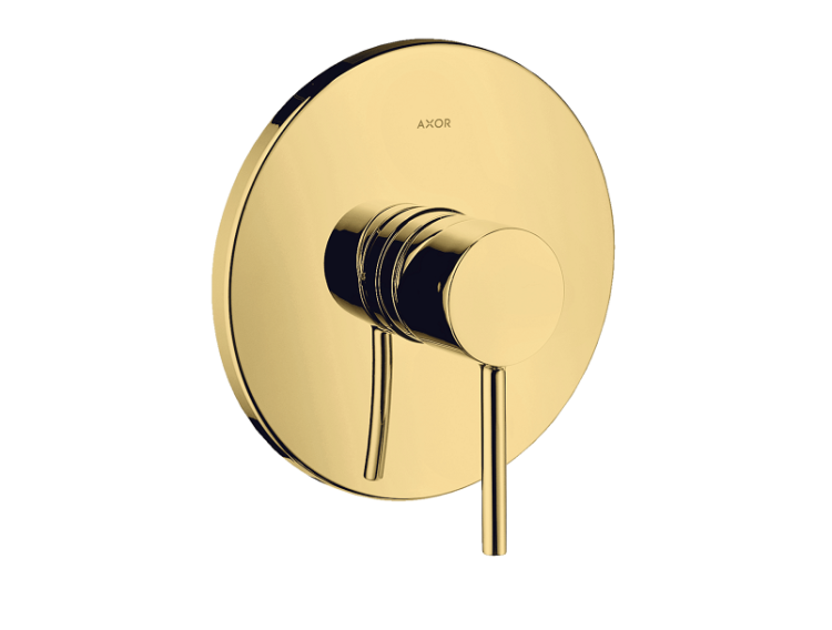 Смеситель для душа, Hansgrohe, Axor Starck, тип открывания воды-однорычажный, тип регулирования воды-керамический узел смешивания, тип установки-встраиваемый, отверстия для монтажа-1, внутренняя часть-необходимо заказать, цвет-полированное золото, регулируемое ограничение температуры, с шумопоглотителем Смеситель для душа, Hansgrohe, Axor Starck, цвет-полированное золото