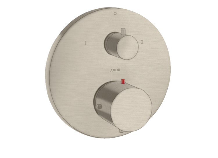 Смеситель для душа, Hansgrohe, Axor Starck, тип открывания воды-вентильный, тип регулирования воды-традиционный картридж, тип установки-встраиваемый, отверстия для монтажа-2, внутренняя часть-необходимо заказать, цвет-шлифованный никель, 2 потребителя, с запорным и переключающим вентелем, предохранительный ограничитель при 38°C, регулируемое ограничение температуры Смеситель для душа, Hansgrohe, Axor Starck, цвет-шлифованный никель