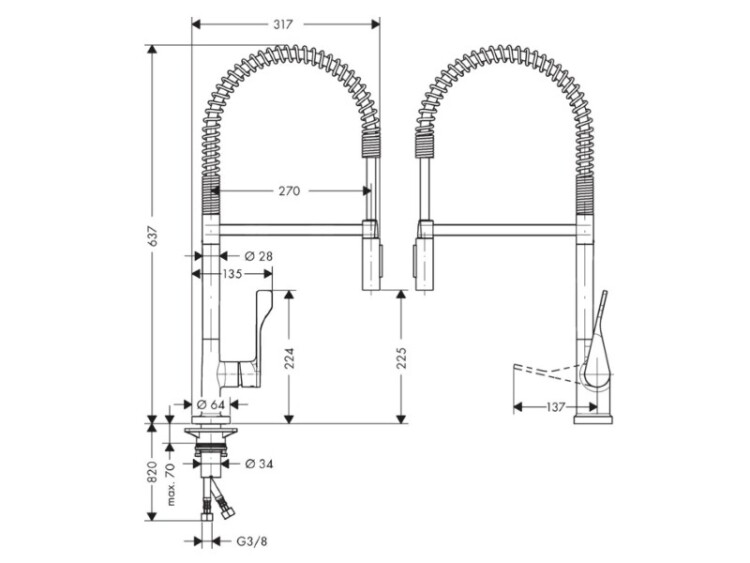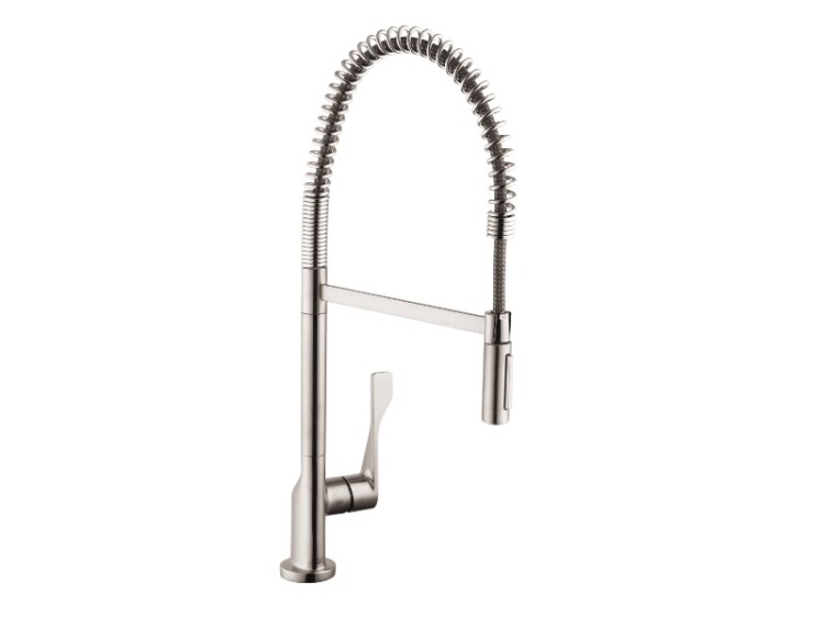 Смеситель для кухни, Hansgrohe, Axor Citterio, Semi-Pro, тип открывания воды-однорычажный, тип регулирования воды-керамический узел смешивания, отверстия для монтажа-1, высота, мм-637, вынос излива, мм-270, тип излива-поворотный, угол поворота излива-360°, дополнительные функции-душ, тип подводки-гибкая, стандарт подвода воды-3/8", цвет-под сталь, переключение струи в исходное положение нажатием кнопки Смеситель для кухни, Hansgrohe, Axor Citterio, цвет-под сталь