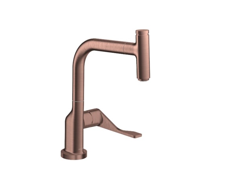 Смеситель для кухни, Hansgrohe, Axor Citterio, тип открывания воды-однорычажный, тип регулирования воды-керамический узел смешивания, отверстия для монтажа-1, высота, мм-342, вынос излива, мм-219, тип излива-поворотный, дополнительные функции-выдвижной душ, стандарт подвода воды-3/8", цвет-шлифованное красное золото, угол поворота излива 150°, Кнопка Select для включения/выключения воды, магнитная система крепления душа MagFit, душевой шланг Quick-Connect Смеситель для кухни, Hansgrohe, Axor Citterio, цвет-шлифованное красное золото