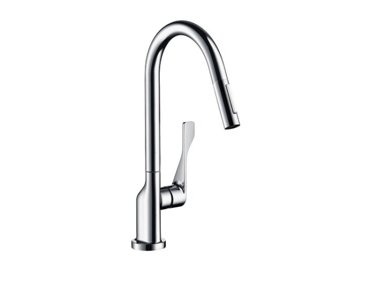 Смеситель для кухни, Hansgrohe, Axor Citterio, тип открывания воды-однорычажный, тип установки-на мойку, отверстия для монтажа-1, высота, мм-427, вынос излива, мм-220, тип излива-поворотный, угол поворота излива-регулировка на 2 уровня, на 110° или 150°, дополнительные функции-2 типа струи-обычная и душевая, фиксируемая душевая струя, переключение струи в исходное положение нажатием кнопки, магнитная система крепления душа MagFit, душевой шланг Quick-Connect, тип подводки-гибкая, стандарт подвода воды-3/8", цвет-шлифованный никель Смеситель для кухни, Hansgrohe, Axor Citterio, цвет-шлифованный никель