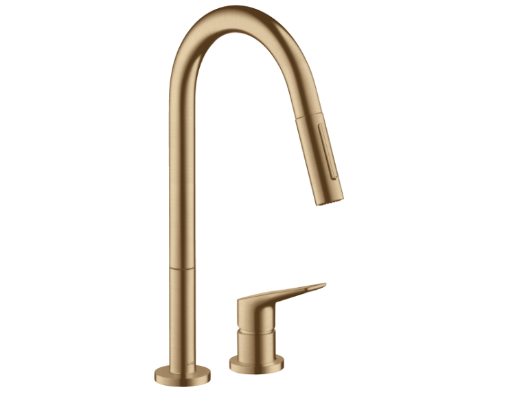 Смеситель для кухни, Hansgrohe, Axor Citterio M, тип открывания воды-однорычажный, тип регулирования воды-керамический узел смешивания, отверстия для монтажа-2, высота, мм-405, вынос излива, мм-221, тип излива-поворотный, выдвижной, дополнительные функции-выдвижной душ, тип подводки-гибкая, стандарт подвода воды-3/8", цвет-шлифованная бронза, угол поворота излива-регулировка на 2 уровня, на 110° или 150°, переключение струи в исходное положение нажатием кнопки, магнитная система крепления душа MagFit, душевой шланг Quick-Connect Смеситель для кухни, Hansgrohe, Axor Citterio M, цвет-шлифованная бронза