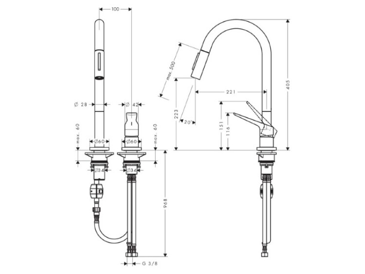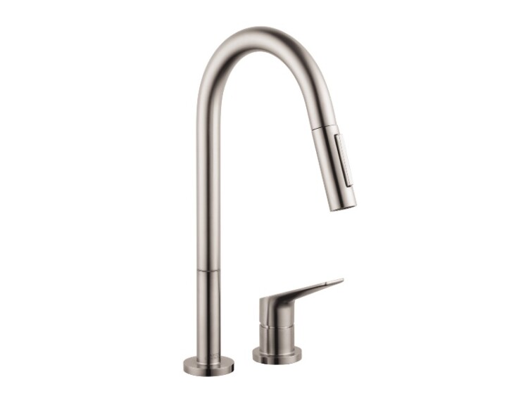 Смеситель для кухни, Hansgrohe, Axor Citterio M, тип открывания воды-однорычажный, тип регулирования воды-керамический узел смешивания, отверстия для монтажа-2, высота, мм-405, вынос излива, мм-221, тип излива-поворотный, выдвижной, угол поворота излива-регулировка на 2 уровня, на 110° или 150°, дополнительные функции-душ, тип подводки-гибкая, стандарт подвода воды-3/8", цвет-сталь, переключение струи в исходное положение нажатием кнопки, магнитная система крепления душа MagFit, душевой шланг Quick-Connect Смеситель для кухни, Hansgrohe, Axor Citterio M, цвет-сталь