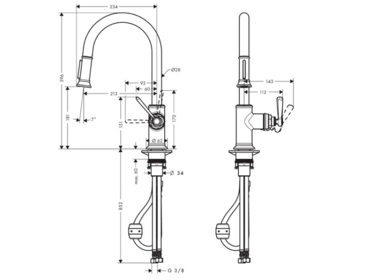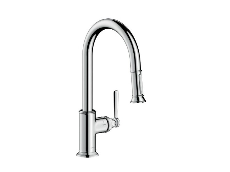 Смеситель для кухни, Hansgrohe, Axor Montreux, тип открывания воды-однорычажный, тип регулирования воды-керамический узел смешивания, отверстия для монтажа-1, высота, мм-396, вынос излива, мм-213, тип излива-поворотный, выдвижной, дополнительные функции-выдвижной душ, тип подводки-гибкая, стандарт подвода воды-3/8", цвет-хром, обычная и душевая струя, переключение струи в исходное положение нажатием кнопки, магнитная система крепления душа MagFit Смеситель для кухни, Hansgrohe, Axor Montreux, цвет-хром