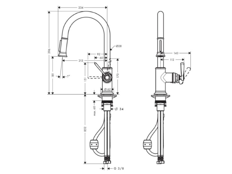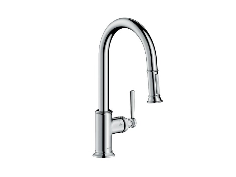 Смеситель для кухни, Hansgrohe, Axor Montreux, тип открывания воды-однорычажный, тип регулирования воды-керамический узел смешивания, отверстия для монтажа-1, высота, мм-396, вынос излива, мм-213, тип излива-поворотный, выдвижной, дополнительные функции-душ, тип подводки-гибкая, стандарт подвода воды-3/8", цвет-шлифованная бронза, угол поворота излива-регулировка на 2 уровня, на 110° или 150°, переключение струи в исходное положение нажатием кнопки, магнитная система крепления душа MagFit, душевой шланг Quick-Connect Смеситель для кухни, Hansgrohe, Axor Montreux, цвет-шлифованная бронза