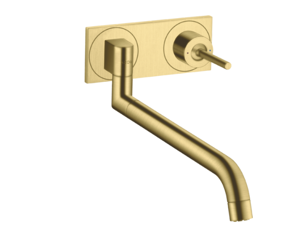 Смеситель для кухни, Axor, Axor Uno, тип открывания воды-однорычажный, тип регулирования воды-керамический картридж, монтаж-настенный, отверстия для монтажа-2, вынос излива, мм-500, тип излива-поворотный, тип подводки-жесткая, цвет-медь шлифованная Смеситель для кухни, Axor, Axor Uno, цвет-медь шлифованная