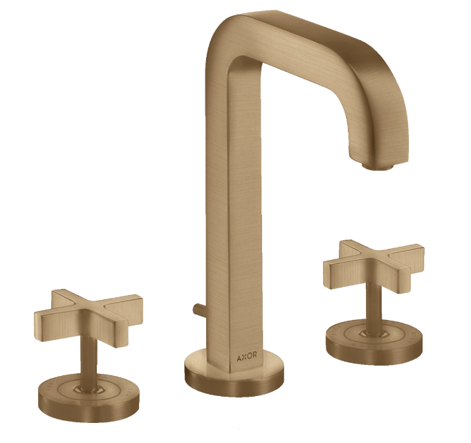 Смеситель для раковины, Axor, Citterio, тип открывания воды-вентильный, тип регулирования воды-керамический картридж, монтаж-на раковину/столешницу, отверстия для монтажа-3, высота, мм-230, вынос излива, мм-140, тип излива-неподвижный, донный клапан-есть, тип подводки-гибкая, стандарт подвода воды-3/8", с крестообразными рукоятками, с отдельными розетками, цвет-бронза шлифованная Смеситель для раковины, Axor, Citterio, цвет-бронза шлифованная