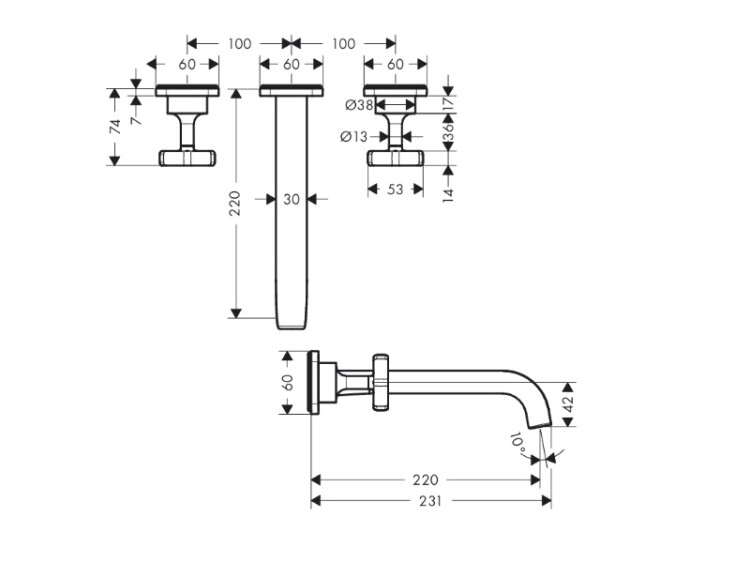 Смеситель для раковины, Axor, Citterio E, тип открывания воды-вентильный, тип регулирования воды-керамическая кран-букса, монтаж-настенный встраиваемый, отверстия для монтажа-3, высота, мм-60, вынос излива, мм-220, тип излива-неподвижный, материал ручки-металл, цвет ручки-в цвет смесителя, стандарт подвода воды-1/2", внутренняя часть-необходимо заказать, цвет-хром Смеситель для раковины, Axor, Citterio E, цвет-хром