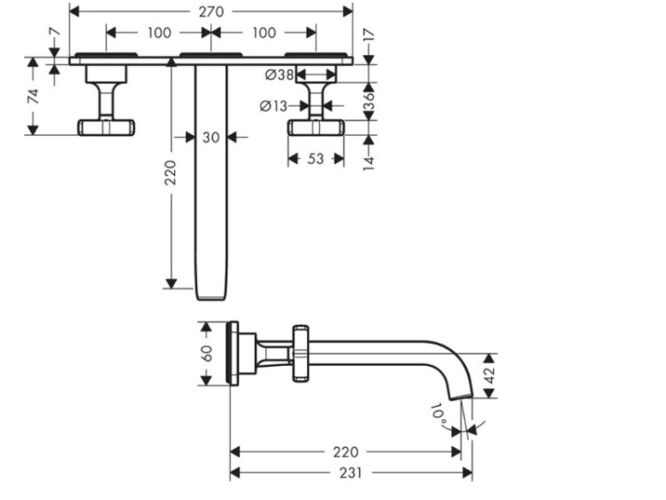 Смеситель для раковины, Hansgrohe, Axor Citterio E, тип открывания воды-двухвентильный, тип регулирования воды-керамический вентиль, тип установки-настенный, отверстия для монтажа-3, вынос излива, мм-220, внутренняя часть-необходимо заказать, цвет-хром, с панелью Смеситель для раковины, Hansgrohe, Axor Citterio E, цвет-хром