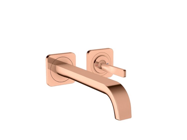 Смеситель для раковины, Hansgrohe, Axor Citterio E, тип открывания воды-однорычажный, тип регулирования воды-керамический узел смешивания, тип установки-настенный, отверстия для монтажа-2, вынос излива, мм-220, вид ручки-джойстикового типа, с возможностью размещения рукоятки справа или слева, внутренняя часть-необходимо заказать, цвет-полированное красное золото Смеситель для раковины, Hansgrohe, Axor Citterio E, цвет-полированное красное золото