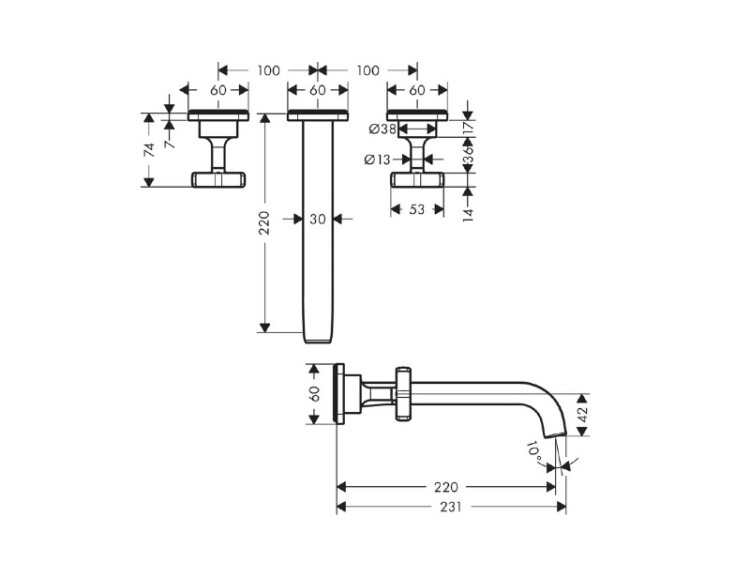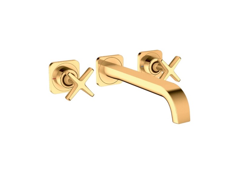 Смеситель для раковины, Hansgrohe, Axor Citterio E, тип открывания воды-двухвентильный, тип регулирования воды-керамический картридж, тип установки-настенный, отверстия для монтажа-3, вынос излива, мм-220, внутренняя часть-необходимо заказать, цвет-полированное золото Смеситель для раковины, Hansgrohe, Axor Citterio E, цвет-полированное золото