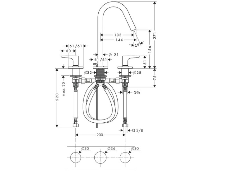 Смеситель для раковины, Hansgrohe, Axor Citterio M, тип открывания воды-двухрычажный, тип регулирования воды-керамический вентиль, отверстия для монтажа-3, высота, мм-271, вынос излива, мм-135, тип излива-короткий, стандарт подвода воды-3/8", цвет-хром Смеситель для раковины, Hansgrohe, Axor Citterio M, цвет-хром