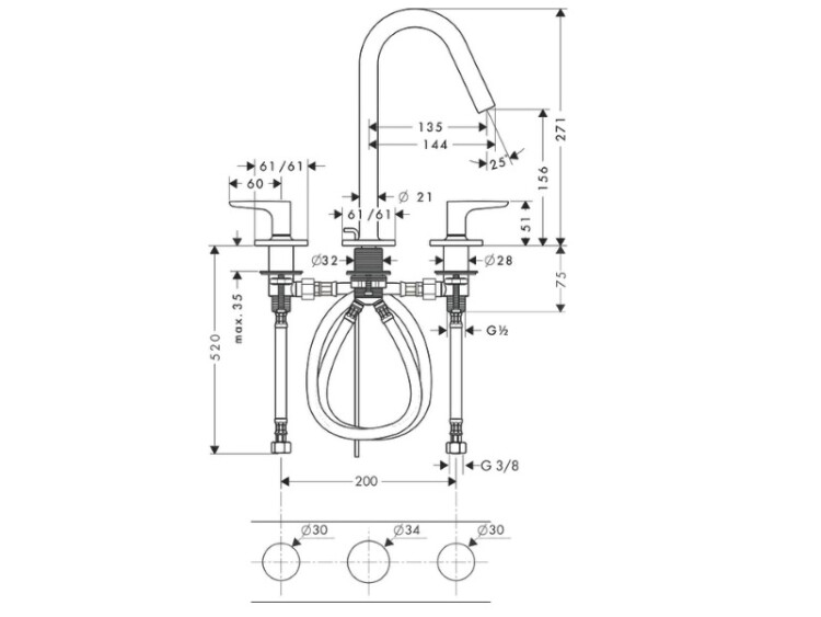 Смеситель для раковины, Hansgrohe, Axor Citterio M, тип открывания воды-двухрычажный, тип регулирования воды-керамический вентиль, отверстия для монтажа-3, высота, мм-271, вынос излива, мм-135, тип излива-короткий, стандарт подвода воды-3/8", цвет-шлифованный никель Смеситель для раковины, Hansgrohe, Axor Citterio M, цвет-шлифованный никель