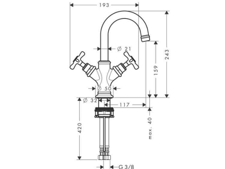 Смеситель для раковины, Hansgrohe, Axor Montreux, тип открывания воды-двухвентильный, тип регулирования воды-керамический узел смешивания, отверстия для монтажа-1, высота, мм-243, вынос излива, мм-117, тип излива-поворотный, угол поворота излива-120°, донный клапан-есть, тип подводки-гибкая, стандарт подвода воды-3/8", цвет-полированное золото, для маленькой раковины Смеситель для раковины, Hansgrohe, Axor Montreux, цвет-полированное золото