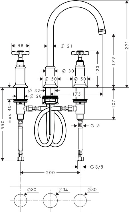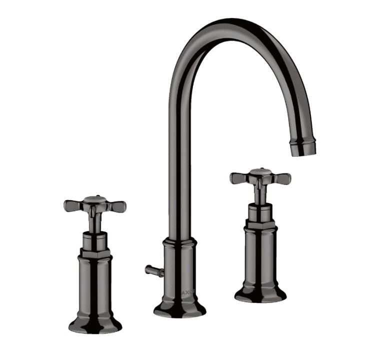 Смеситель для раковины, Hansgrohe, Axor Montreux, тип открывания воды-вентильный, с крестообразными рукоятками, тип регулирования воды-керамическая кран-букса, монтаж-на раковину/столешницу, отверстия для монтажа-3, высота, мм-291, вынос излива, мм-175, тип излива-поворотный, донный клапан-есть, тип подводки-гибкая, стандарт подвода воды-3/8", цвет-Polished Black Chrome Смеситель для раковины, Hansgrohe, Axor Montreux, цвет-Polished Black Chrome