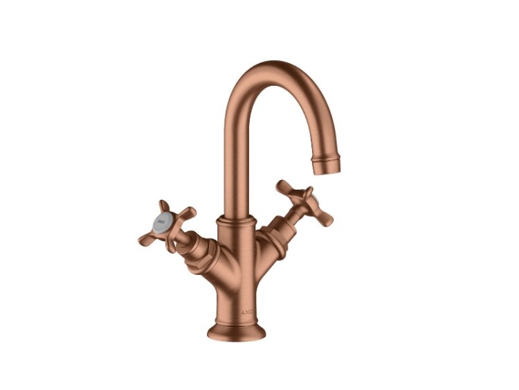 Смеситель для раковины, Hansgrohe, Axor Montreux, тип открывания воды-двухвентильный, тип регулирования воды-керамический узел смешивания, отверстия для монтажа-1, высота, мм-243, вынос излива, мм-117, тип излива-поворотный, угол поворота излива-120°, донный клапан-есть, тип подводки-гибкая, стандарт подвода воды-3/8", цвет-шлифованное красное золото, для маленькой раковины Смеситель для раковины, Hansgrohe, Axor Montreux, цвет-шлифованное красное золото