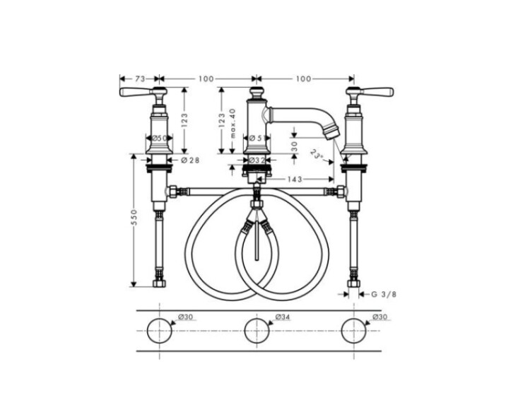 Смеситель для раковины, Hansgrohe, Axor Montreux, тип открывания воды-двухвентильный, тип регулирования воды-керамический вентиль, отверстия для монтажа-3, высота, мм-123, вынос излива, мм-142, стандарт подвода воды-3/8", цвет-шлифованное золото Смеситель для раковины, Hansgrohe, Axor Montreux, цвет-шлифованное золото