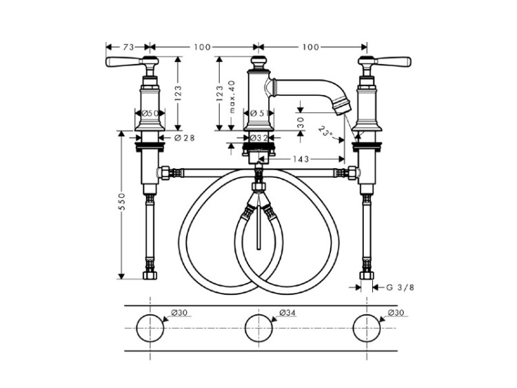 Смеситель для раковины, Hansgrohe, Axor Montreux, тип открывания воды-двухвентильный, тип регулирования воды-керамический вентиль, отверстия для монтажа-3, высота, мм-123, вынос излива, мм-142, вид ручки-рукоятка, донный клапан-есть, стандарт подвода воды-3/8", цвет-шлифованный никель Смеситель для раковины, Hansgrohe, Axor Montreux, цвет-шлифованный никель
